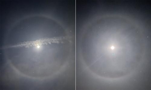 MỸ-Hào quang Mặt Trăng rực sáng thực chất là ảo ảnh quang học hình thành khi ánh sáng bị các tinh thể băng trong mây khúc xạ. ...[+]