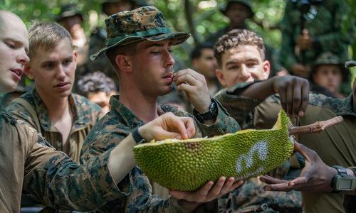 Bức ảnh lính Mỹ tập ăn hoa quả nhiệt đới trong khóa huấn luyện sinh tồn ở Singapore thu hút sự chú ý của nhiều người. ...[+]