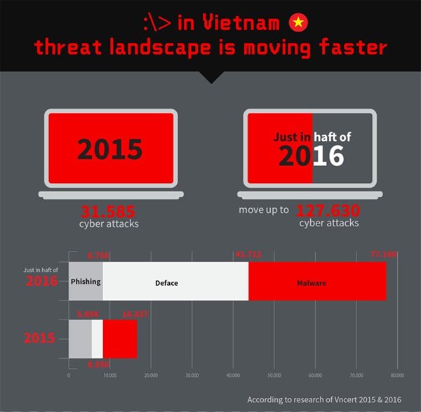 Theo số liệu từ Trung tâm Ứng cứu khẩn cấp máy tính (Vncert), năm 2015 đã ghi nhận 31.585 sự cố, bao gồm 5.898 sự cố Phishing (lừa đảo), 8.850 sự cố Deface (thay đổi giao diện trang web) và 16.837 sự cố Malware (tấn công bằng mã độc). Hơn thế, chỉ tính riêng sáu tháng đầu năm nay, con số này đã tăng lên gấp 3 – 4 lần so với tổng số vụ tấn công cả năm 2015. Điều này cho thấy mối đe dọa tới an ninh mạng Việt Nam đã ở mức khẩn cấp.